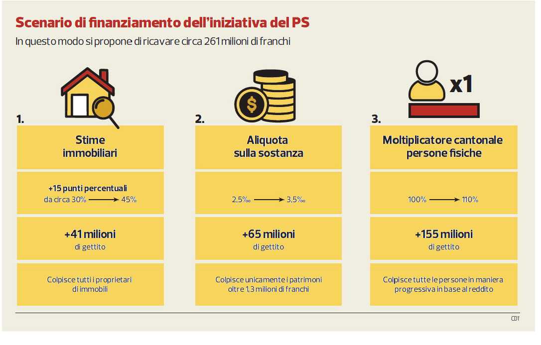 La seconda misura consiste nel ripristino dell’aliquota massima del 3,5 per mille sulla sostanza. «Si tornerebbe alla situazione precedente il 2018, quando è stata introdotta la riforma fisco- sociale », commenta Vorpe. Quest’ultima ha permesso una riduzione dell’aliquota massima dell’imposta sulla sostanza dal 3,5 al 2,5 per mille e l’introduzione di misure di politica sociale a favore delle famiglie. «Un ritorno al 3,5 per mille significherebbe riaumentare la pressione sui grandi patrimoni. Oggi il Ticino, con un’aliquota cantonale del 2,5 per mille si colloca nella media svizzera; riportandola al 3,5 per mille scivolerebbe agli ultimi posti ».